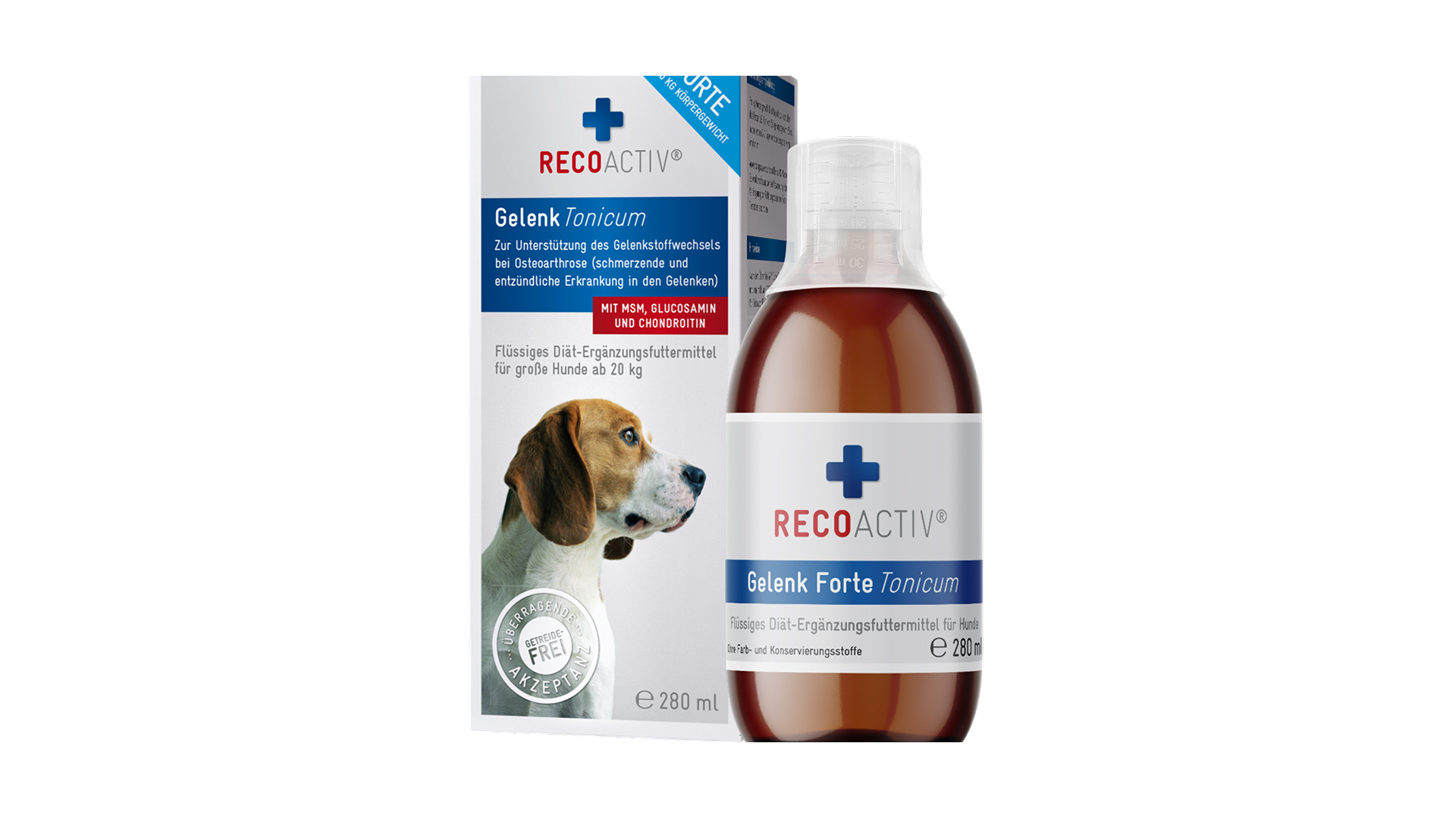 RECOACTIV® Gelenk Tonicum Forte wurde speziell entwickelt, um den Gelenkstoffwechsel bei Osteoarthrose zu regulieren und die Beweglichkeit auch bei größeren Hunden zu erhalten.