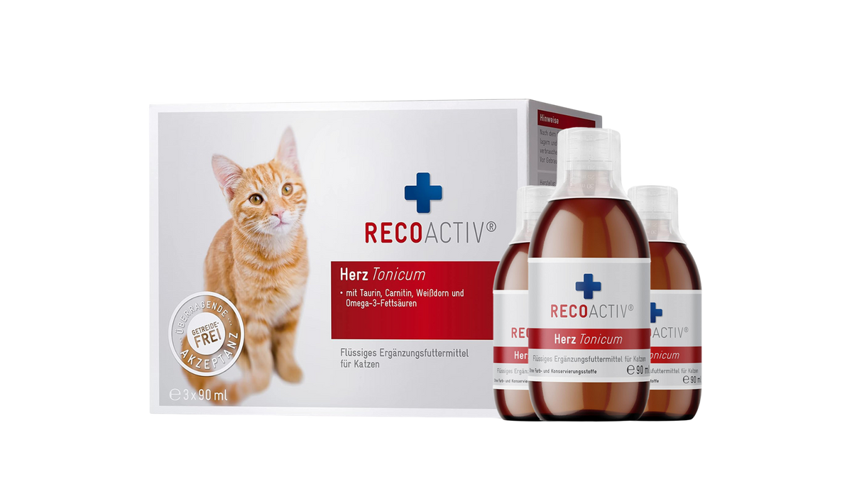 RECOACTIV® Herz Tonicum wurde speziell entwickelt, um die Herzgesundheit von Katzen zu unterstützen und Herzfunktionsstörungen vorzubeugen.