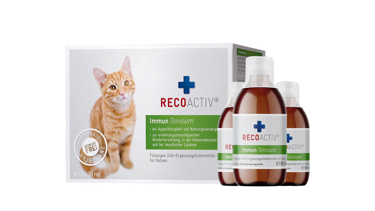 RECOACTIV® Immun Tonicum für Katzen ist ein appetitanregendes Diät-Ergänzungsfuttermittel zur ernährungsphysiologischen Wiederherstellung für schlecht fressende und geschwächte Katzen infolge von Unwohlsein, Krankheit oder Operationen sowie bei hepatischer Lipidose. Dank seiner herausragenden Akzeptanz erfüllt RECOACTIV® Immun die Funktion eines Appetitanregers und animiert Katzen zur selbständigen Nahrungsaufnahme.